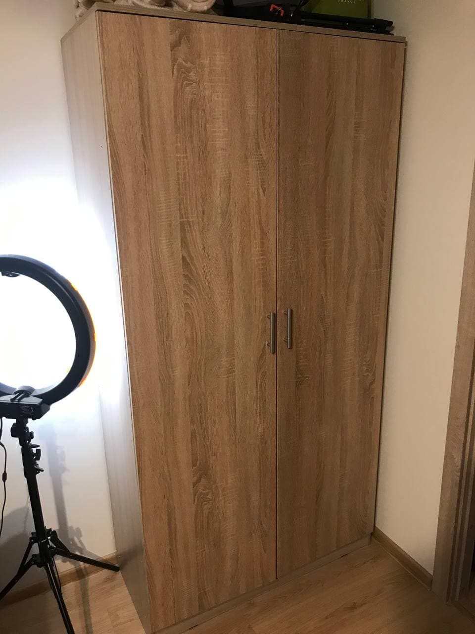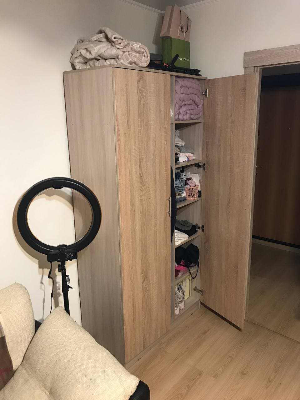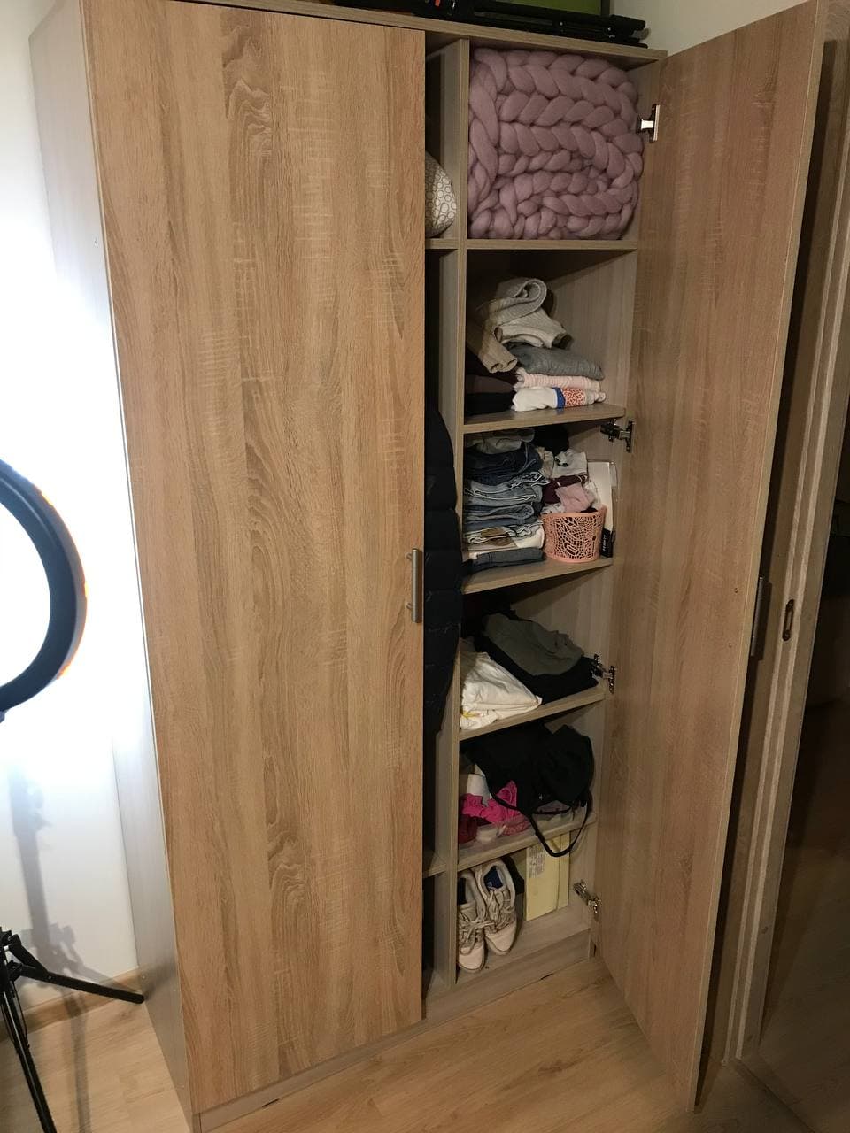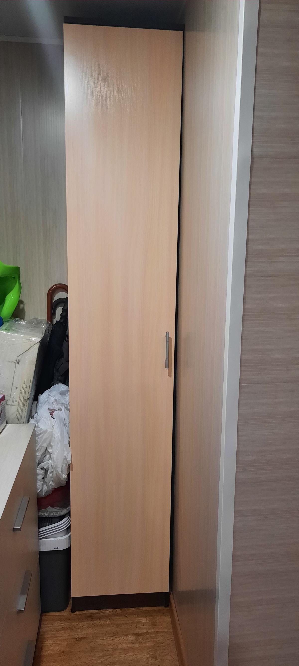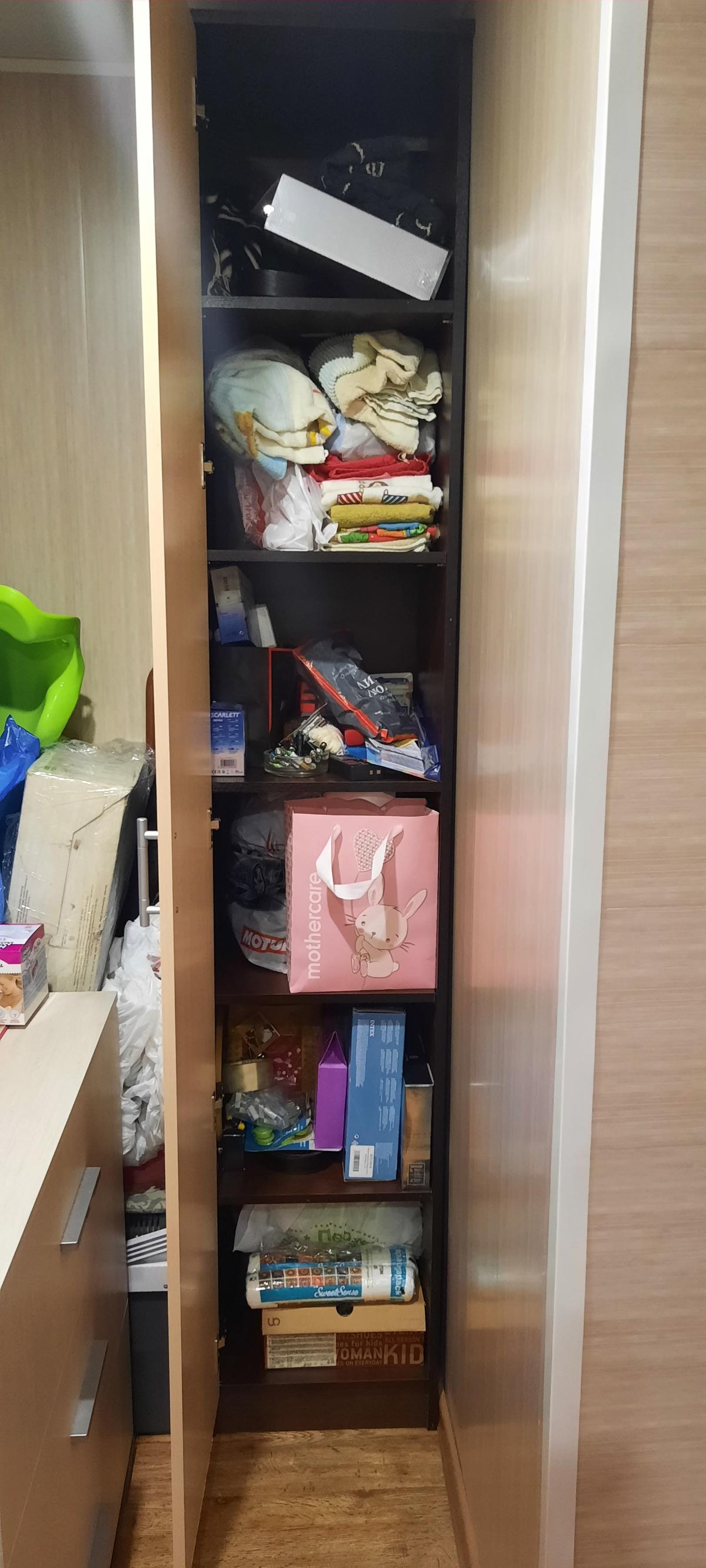 Покупали этот шкаф в детскую. Как место для хранения верхней одежды. Весьма удобная вещь. Есть отдел для хранения с плечиками. Есть отдел с выдвижными ящиками и полочками. Менеджер магазина предложила на выбор укомплектовать шкаф либо поперечной планкой для плечиков, либо выдвижным кронштейном для верхней одежды. Мы выбрали кронштейн. Сборку шкафа я выполнил самостоятельно. Имея простой шуруповерт, она не вызывает затруднений. Хотя и с отверткой вполне можно управиться.