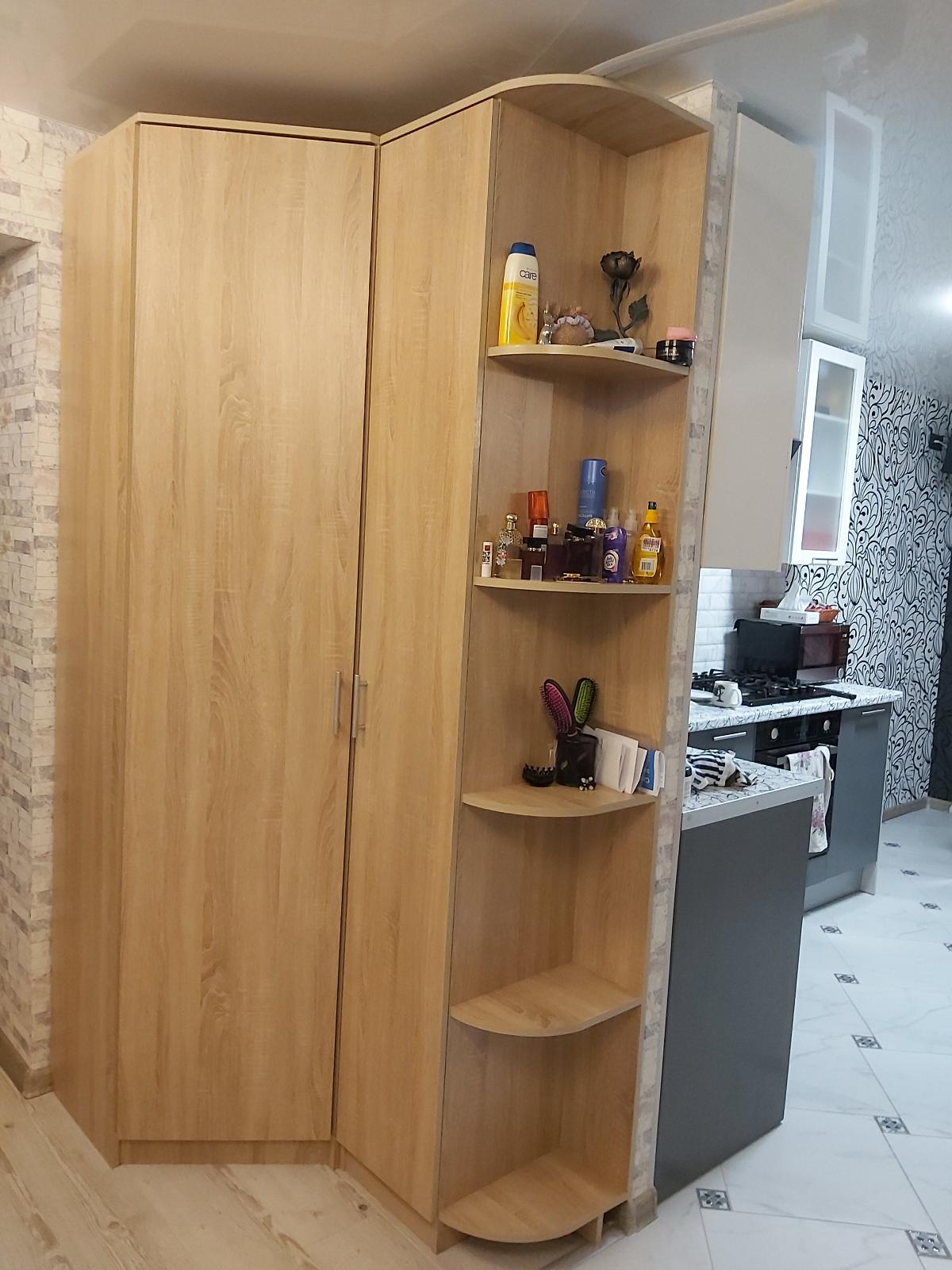Шкаф сделали по нужным нам размерам. Внутри очень вместительный. Дополнили  его угловой полкой. Получилось очень красиво!
