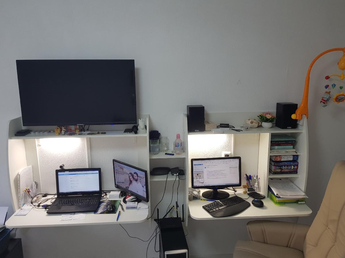 Шкаф нас удивил. Он оказался длинным и тонким (НЕ таким широким и коротким как на ваших картинках). Матового стекла в нем тоже нет. Он весь деревянный (или что там за материал). Мы думали хранить в нем папки, но они, конечно же, НЕ везли. В итоге мы приспособили его под детские вещи и, в целом, довольны. Смотрится стильно, как видите на фото (сверху лежит рамочка, не обращайте внимания). Убираться очень удобно, когда мебель висит. Благодаря вашей компании столы у нас тоже навесные и мы счастливы)