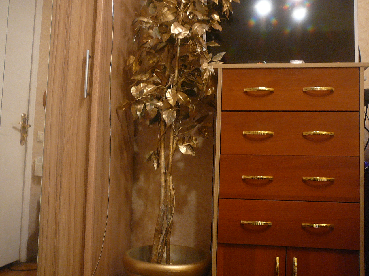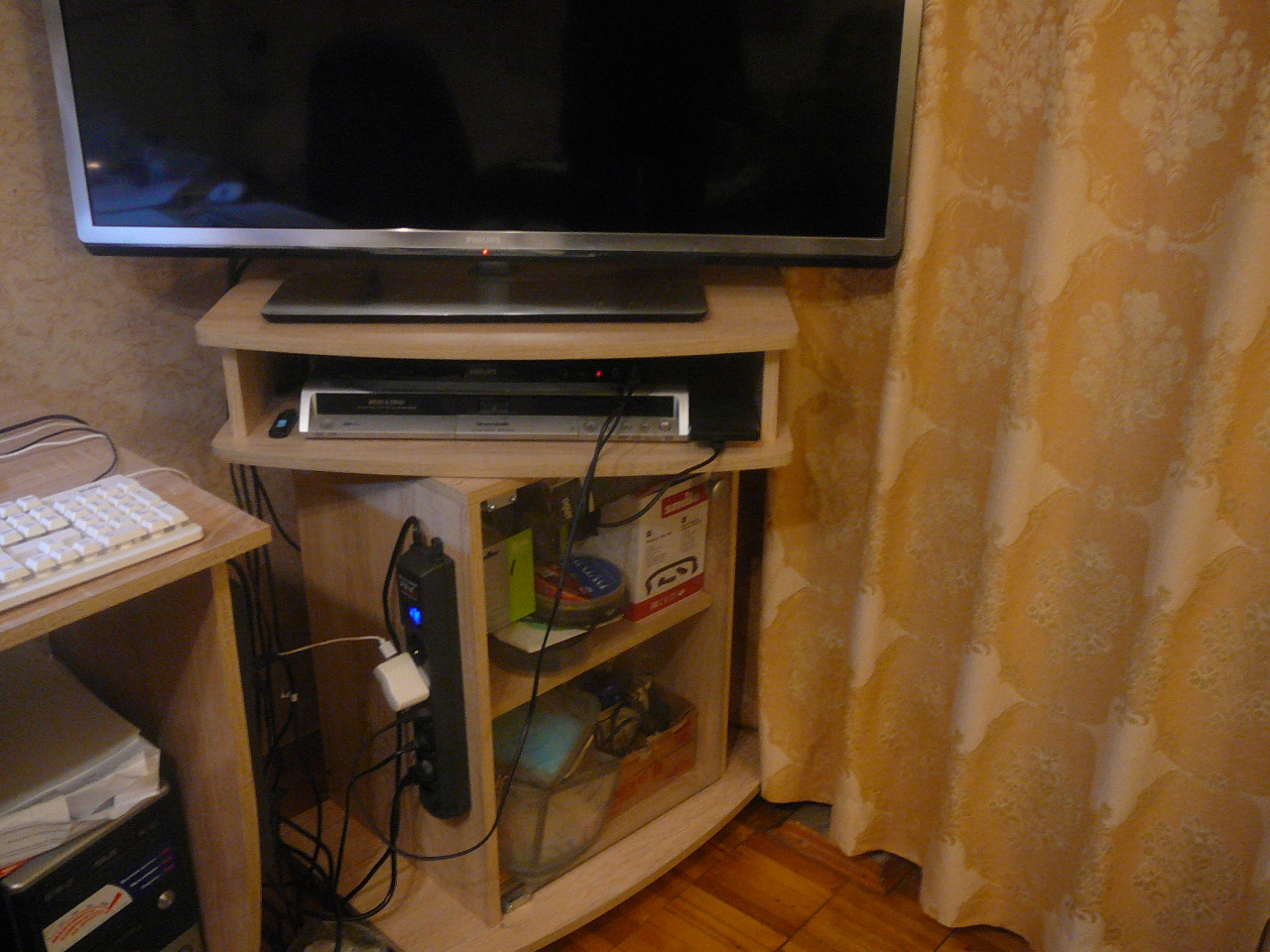 Заказ 201621 Темный цвет сразу же было решено заменить на светлый ,как советуют дизайнеры,в малых комнатах особенно ,также увеличена высота для удобства просмотра телевизора. Сама тумба ,как видно на снимке ,смещает также много : маленький пылесосик, аптечку , диски ДВД и еще много вещей ))))
