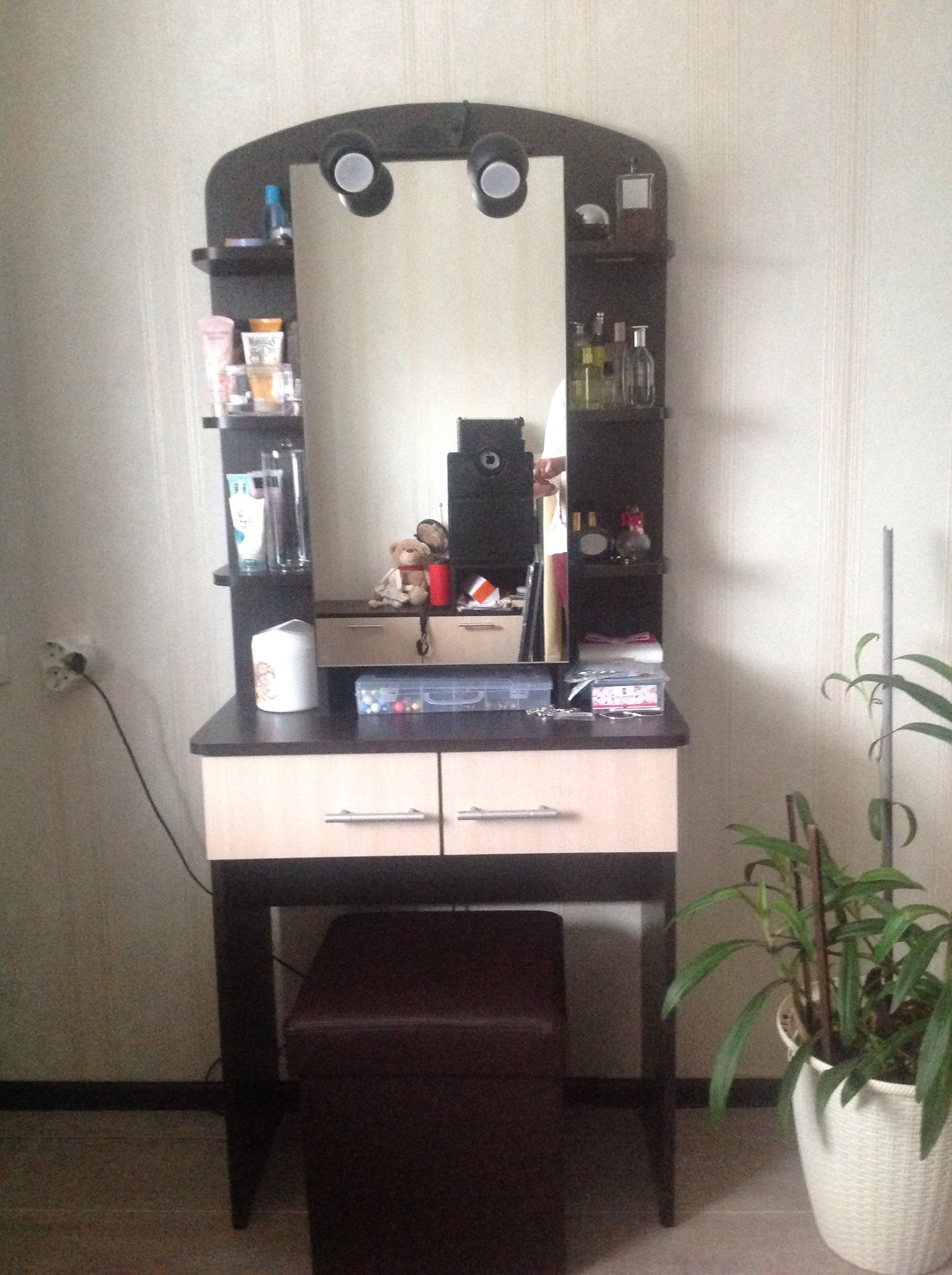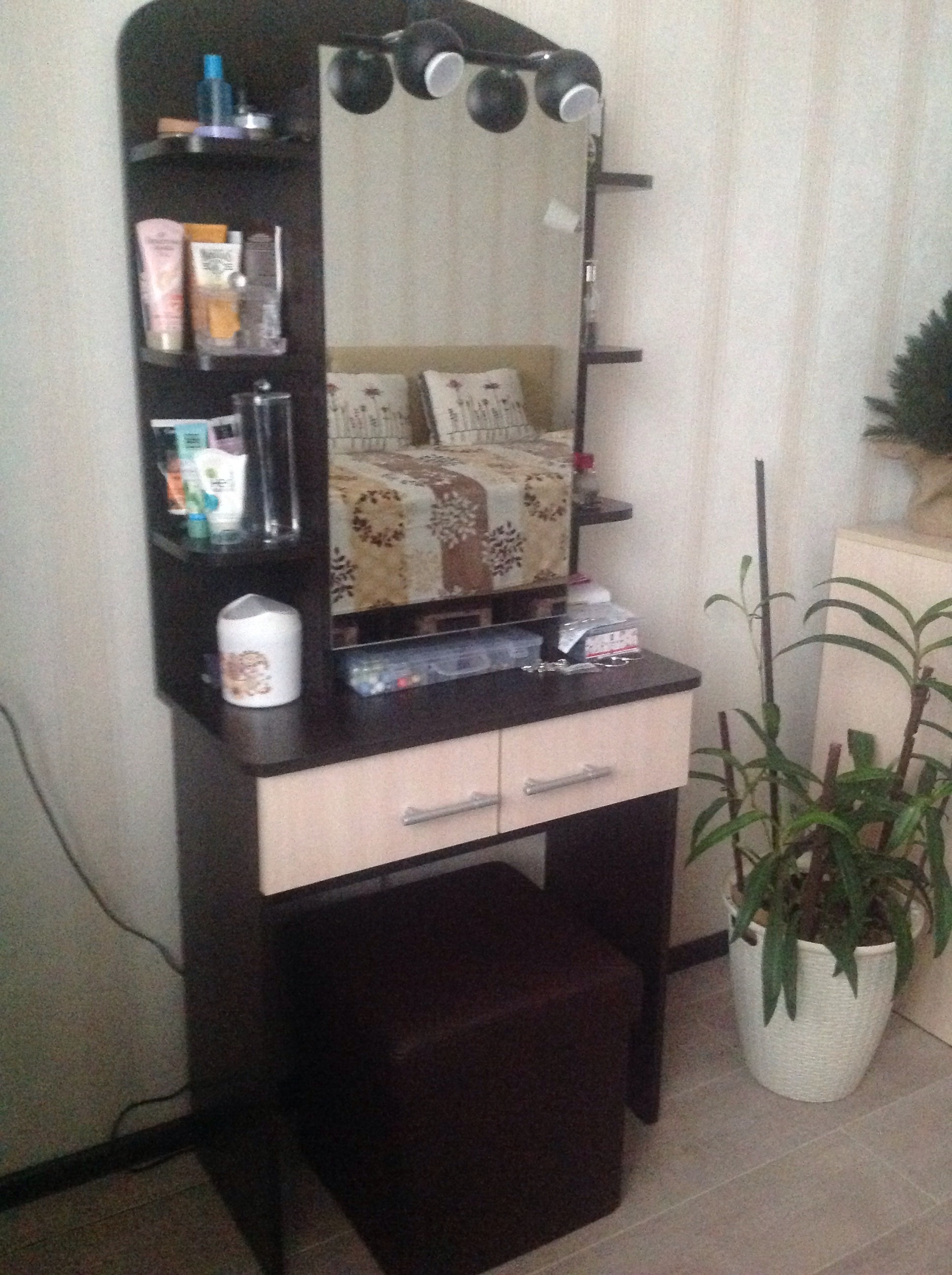 Покупала дочери, она в восторге.Очень стильный,а главное удобный. Много полочек и ящички для хранения косметики.