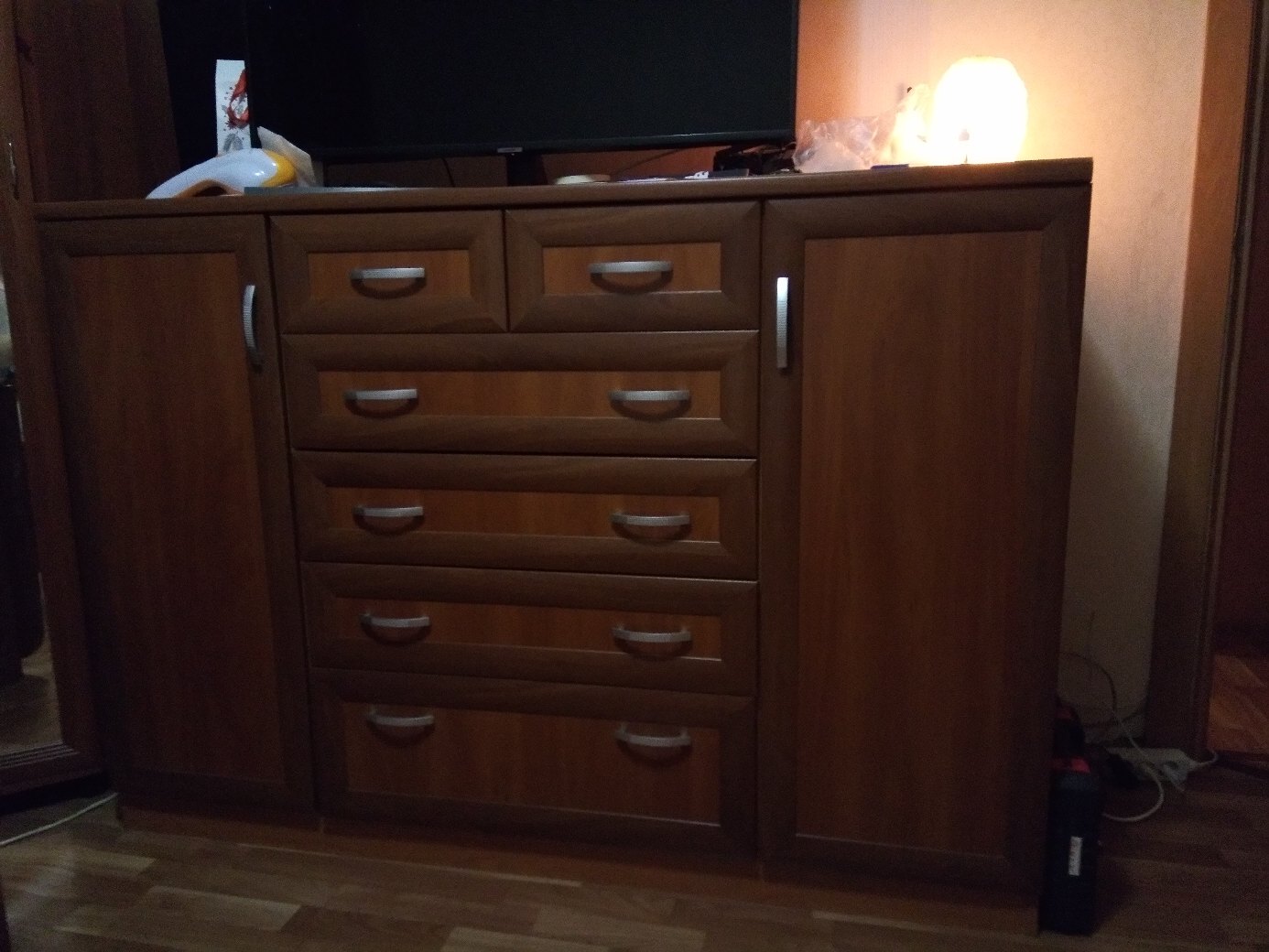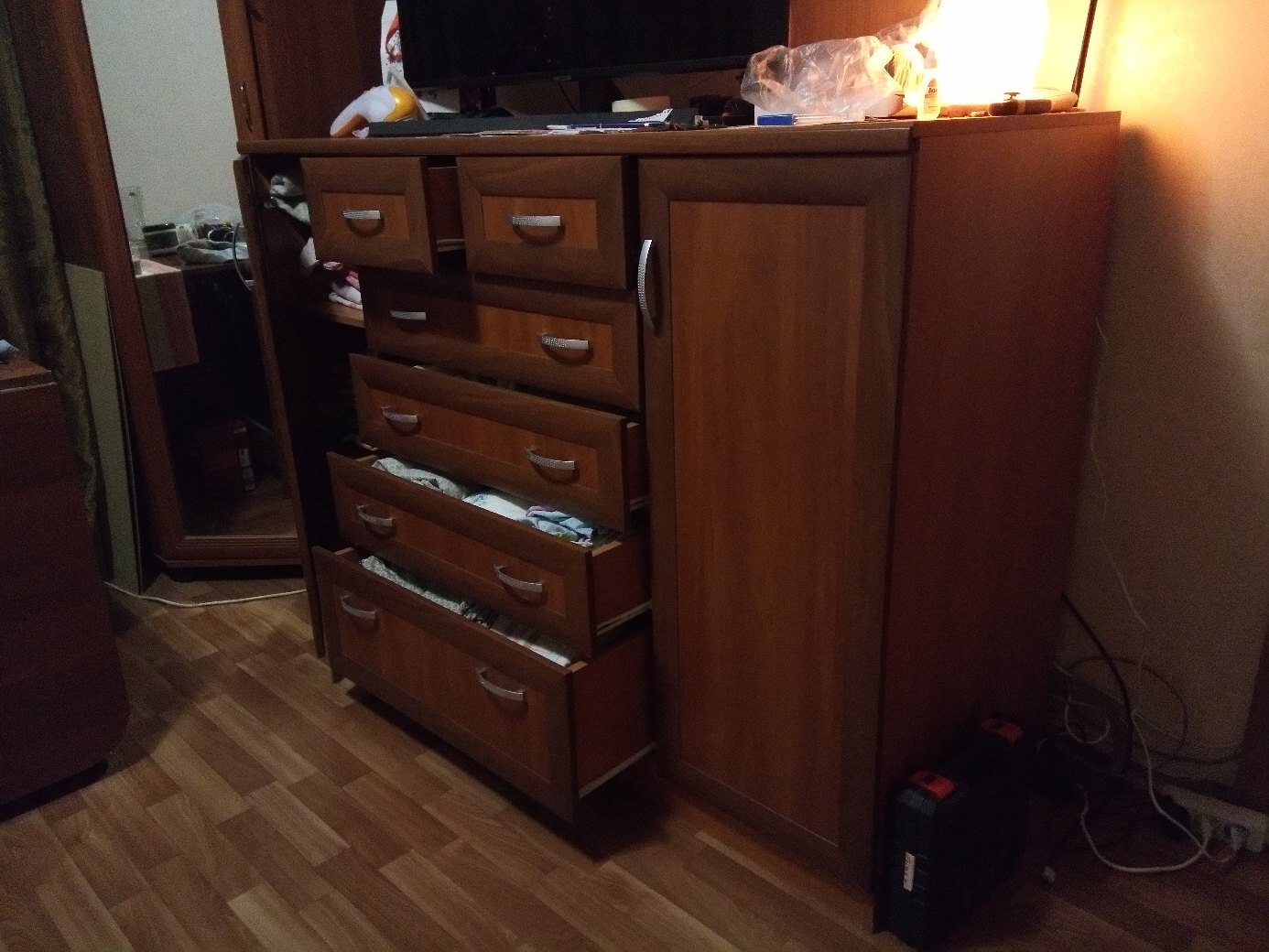 Комодом довольны. Отлично смотрится. С доставкой были проблемы. Но всё-таки все привезли и собрали. Почему-то очень много в упаковках стружки. На каждой детали наклейка, которую приходится отдирать, а потом ещё и клеевой слой удалять (благо что есть уайт-спирит). После сборки приходится все конкретно оттирать и отмывать. Очень порадовало, что довольно большой диапазон выбора размеров. Комод заказали с утолщенной кромкой и шариковыми направляющими. Утолщенная кромка отлично смотрится (по сравнению с обычной, которая была на тумбочке, идущей в подарок к этому заказу).