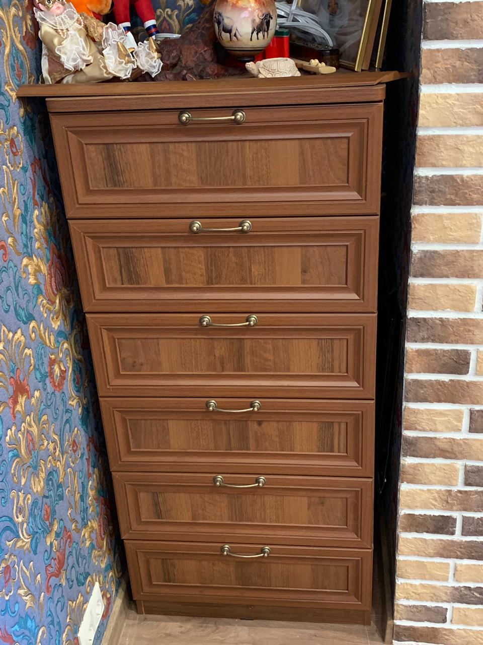 Заказывала комод вместе со шкафом в спальню на дачу. Комод должен был вписаться в нишу между каминной трубой и стеной и быть довольно глубоким. И шкафом и комодом осталась очень довольна! Без особых хлопот заказала нужный цвет, фурнитуру и самое главное  - необходимые мне размеры. Это , без сомнения, на сайте четко отлажено, что ооооочень удобно для клиентов! На фото видно, что по глубине получилось отличное попадание, а по ширине - почему-то изготовили чуть уже запрошенных мною 650 мм, изготовили 610!!! Но ввиду  того, что общее впечатление от мебели приятное, решила не обращать на это внимания. В целом - спасибо! Радость получаю!! Единственное, пожалуйста, разработайте нормальные пошаговые инструкции сборки вашей мебели! Мне кажется это очень важным для  реноме компании!!!